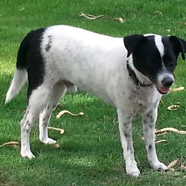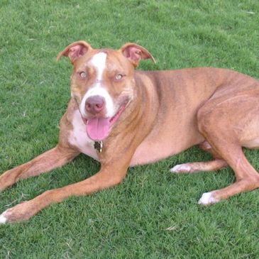 Pit bull, rescued from the mean streets of Chandler. Loves long walks and chasing trucks, bikes, skateboards, scooters, rollerblades, and anything else with wheels. Had major "daddy issues."